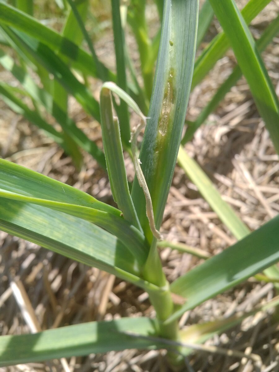 2. When you spot a damaged leaf, peel it back at the stem and you'll almost always find one or two pale-green larvae. Don't worry if you damage the leaf while you peel it back. The garlic plant will gladly grow more leaves to thank you for your help. In fact, I often tear the damaged leaves off so I can see any new problems more easily.
