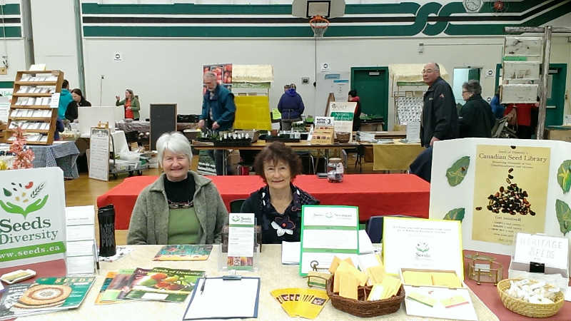 Photo: Volunteers Linda Perkins and Diane Carley behind the Seeds of Diversity table at the Nanaimo Seedy Saturday.